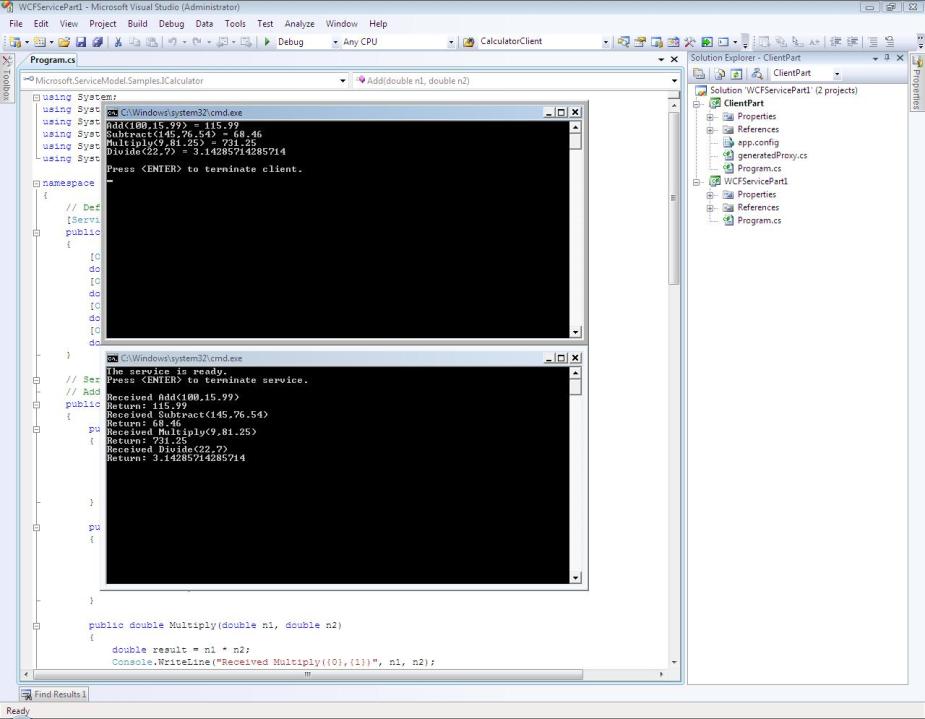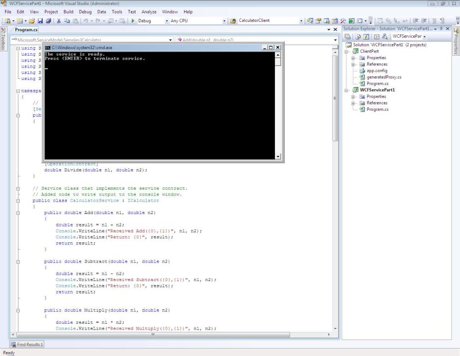 Step 2: Set the Client Project as the startup project & press Ctrl + F5. The console screen popups up with the results displayed. The service console screen