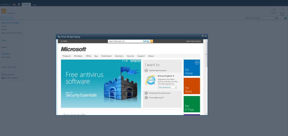 In this part we will see how to setup a modal popup dialog box in SharePoint 2010 using the SP.UI.ModalDialog class.