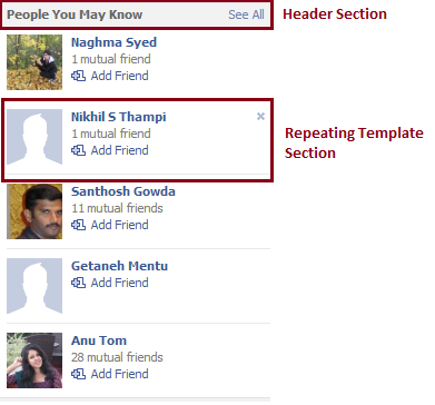 When we look deeper, we could see two major sections here. One is the header and then there a friends list section which is replicated as is 5 times, but with different contents.