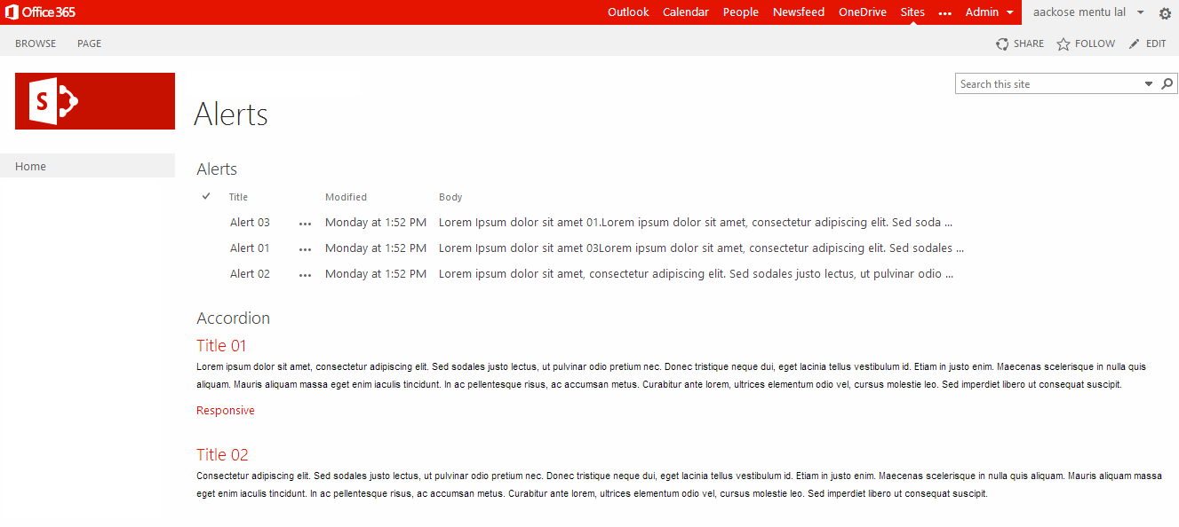 The dashboard page was created and all the 3 list view webparts were added to it. All of them were given 3 different JsLink with different namespaces and method names. Each js had their template methods that rendered the list in the desired views and functionalities. ex. the accordion template method just returned “<h2>{Title}</h2><p>{Description}</p>” and an OnPostRender jQuery script to toggle them on <h2> click.