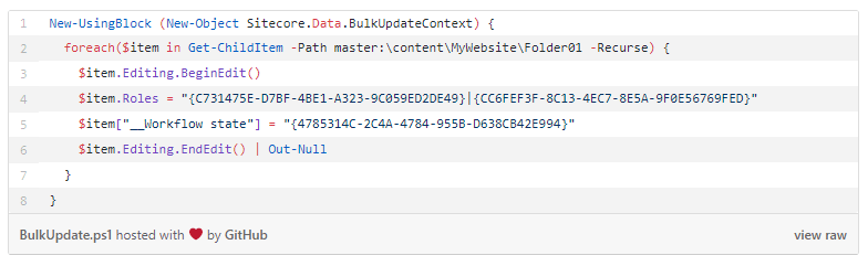 The Powershell module is one of the flexible ways to work with the Sitecore items with ease. If you have not installed the module yet, i highly recommend installing the Sitecore Powershell Extensions module from the Sitecore Marketplace Here is a code snippet to update the Sitecore item fields: https://gist.github.com/aackose/03f68e769aca7baeb98ec1a1d4a3b32e The above script will be recursive ...